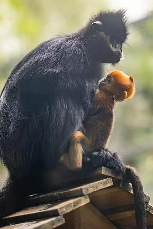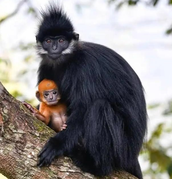 不过,大家可得抓紧时间欣赏这可爱的“小金猴”模样,因为等“小龙”长到 6 个月大时,它的毛发就会逐渐转黑,变得和它的爹妈一样“黑不溜秋”。黑叶猴的成长过程,简直就像一场“颜值反转”的精彩大戏。新生幼崽会像“小龙”一样,浑身覆盖着金黄色的绒毛。那么,浑身黑漆漆的黑叶猴妈妈,为何能生出如此颜值爆表的金猴宝宝呢?