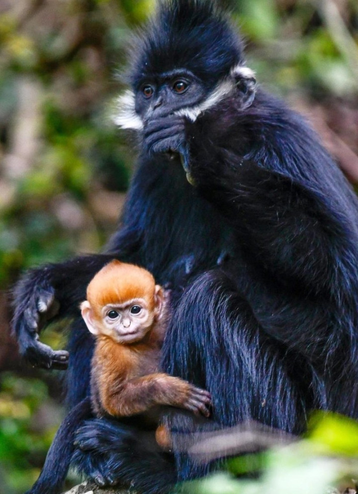 还有研究指出,黑叶猴妈妈的乳汁中可能含有影响毛色变化的特定物质(如激素)。随着宝宝逐渐长大,慢慢脱离母乳,这些影响逐渐褪去,再加上饮食结构的改变,最终导致了毛色的转变。