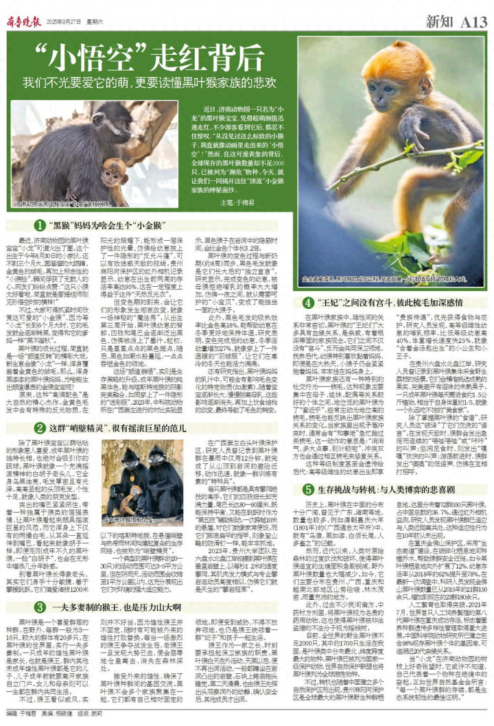 近日,济南动物园一只名为“小龙”的黑叶猴宝宝,凭借超萌颜值迅速蹿红,成为游客心中当之无愧的新晋“网红”。不少游客看到它后,都忍不住惊叹:“从没见过这么标致的小猴子,简直就像动画里走出来的‘小悟空’!”然而,在这可爱表象的背后,全球现存的黑叶猴数量却不足 2000 只,已被列为“濒危”物种。今天,就让我们一同揭开这位“顶流”小金猴家族的神秘面纱。